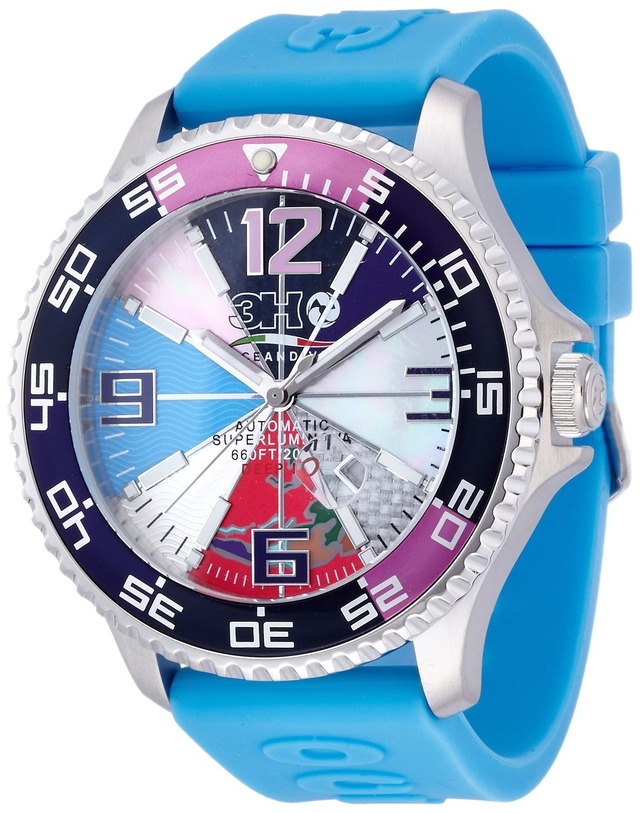 ブランド 3H ITALIA(トレ アッカ イタリア) 型番 M1.AZZURRO 型番 M1.AZZURRO 発売年 2014 ケースの形状 ラウンドフェイス 風防素材 ミネラルガラス 表示タイプ アナログ表示 留め金 バックル(尾錠) ケース素材 ステンレス ケース直径・幅 5.2 cm ケース厚 15.3 mm バンド素材・タイプ シリコン ベルトタイプ バンド幅 26 mm バンドカラー ブルー 文字盤カラー マルチ カレンダー機能 日付表示 本体重量 181 g ムーブメント 自動巻 メーカー保証 1年間保証 ブランド説明:2005年、イタリア・ローマで設立された「3H(トレ・アッカ)」は、イタリアGTカー選手権の大会スポンサーとしても認知されている、新進気鋭の時計ブランドです。素材にチタニウム、カーボンファイバー、ステンレススチール等を巧みに組み合わせながらイタリアンウオッチらしいビビッドで魅力溢れるカラーリングを実現。ヨーロッパのみならず世界中から注目を集めています。「オーシャンダイバー」シリーズの中でも、特にケースサイズ52mmを超えるシリーズはその大胆でインパクトのあるフォルムがトレンドに敏感な人々の間でも支持を得、アーティストやトップアスリートにも愛用されています。ブランド名である「3H」は、三重水素、またはトリチウムの元素記号です。現在はスーパールミノバが使用されてはいますが、かつて時計の針やポインターに使用されていたイルミネーションを意味し、日々の中で「光」を満たす存在であるという意味を込めてネーミングされました。 従来のM1に加え、カラフルで他には類を見ない9色が新たに登場。 200M防水へとグレードアップした防水機能。またセットのシリコンラバーベルトとバネ棒外しで、その日の気分でベルト交換が可能です。これからの季節のマストアイテム!海辺でもお洒落を存分に楽しんで頂けます。