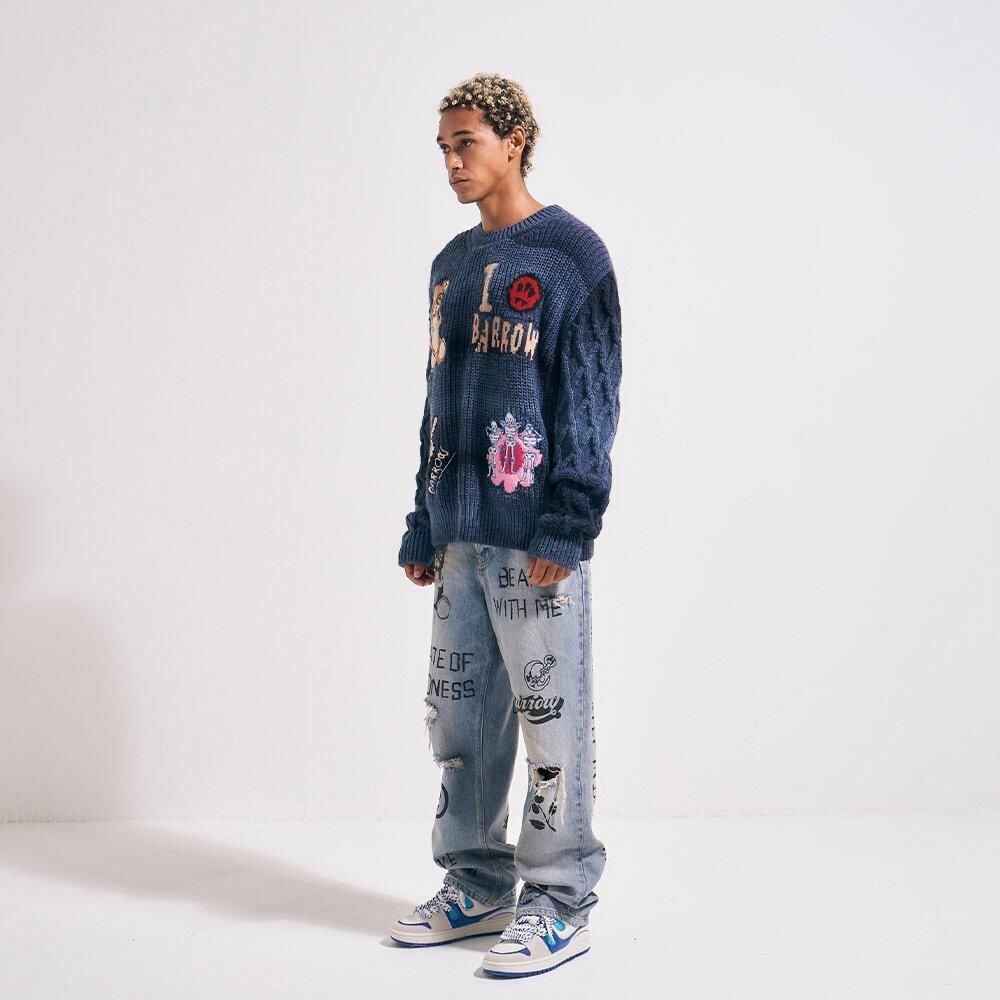 BARROWオリジナルのパッチワークが全体にあしらわれたニット。