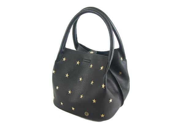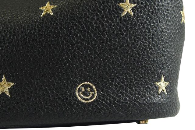 軽くて丈夫、こぶりながらも様々な用途に使えるトートバッグです。 たくさんの刺繍されたスターの中に可愛いスマイルの刺繍が1つあります。 バッグの縁は折り返しの無い加工。とても軽く感じます。