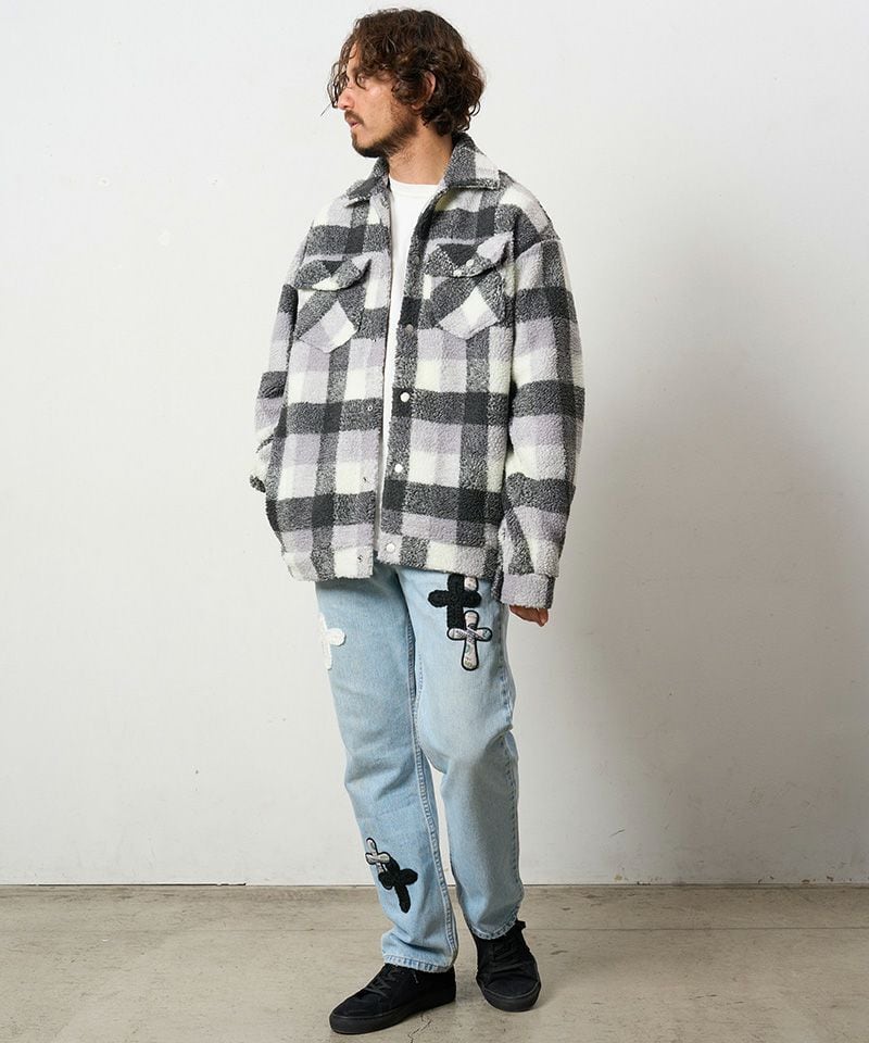 ボリュームある肉厚な風合いのシープボアチェックを使用したGジャンタイプのブルゾン