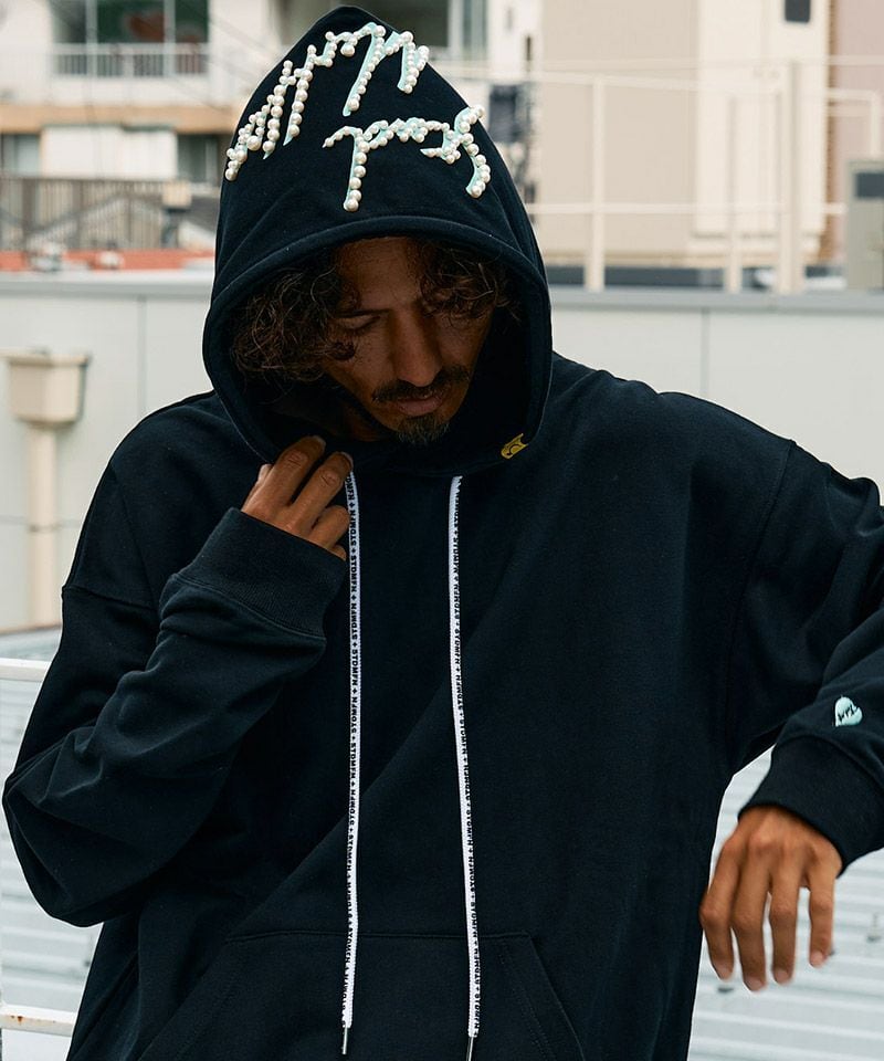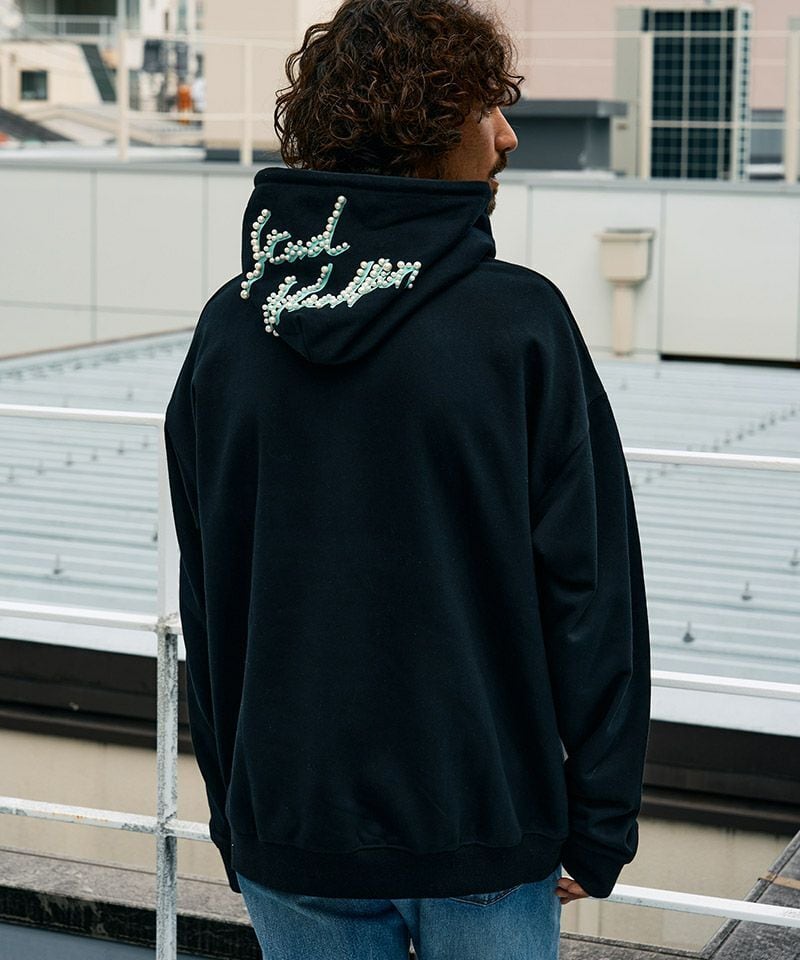 フード全面のロゴプリントに重ねたパールスタッズでインパクト