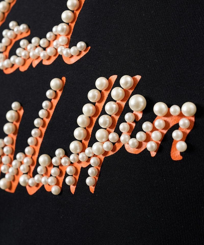 ロゴプリントに重ねたパールスタッズでインパクトあるデザインアクセント