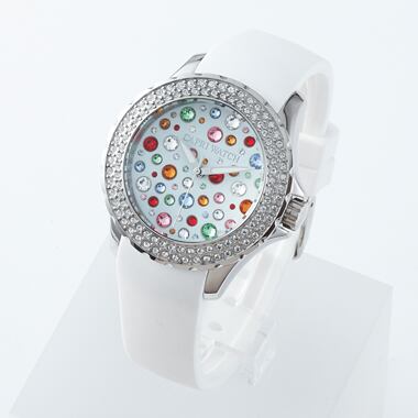 スワロフスキーを全体にあしらったカプリウォッチの代表的なデザインをベースに、カラフルな文字盤仕上げたリストウォッチ。36.5mmの大きさは女性でも付けられるサイズで、ホワイトカラーのラバーバンドはカジュアルにもフォーマルにもぴったりです。