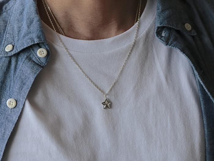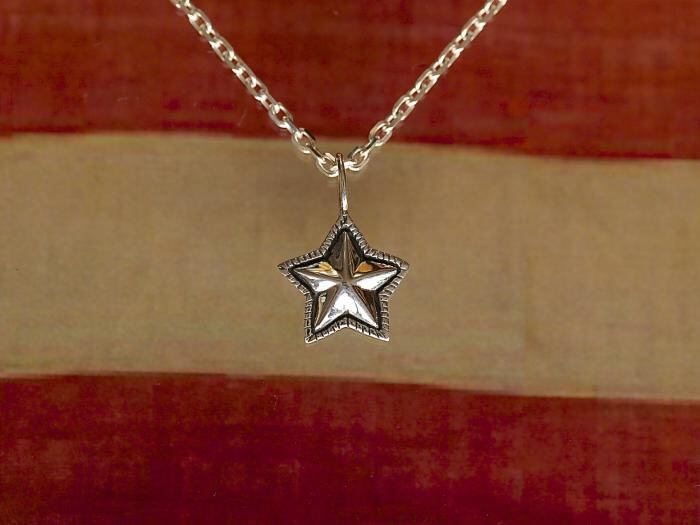 リポウズで抜き出しサイドにコインカットを施したワンスターネックレスになります。スタートップのサイドにはAMPのロゴ刻印が施されています。ゴールドにコーティングされたチャームもアクセントになっております。