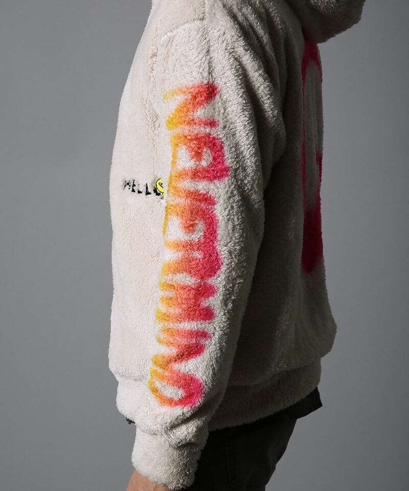 滑らかな風合いのコーラルフリース全体にスプレーグラフィティプリント前身頃にはチェーン刺繍とパッチが入ります。
