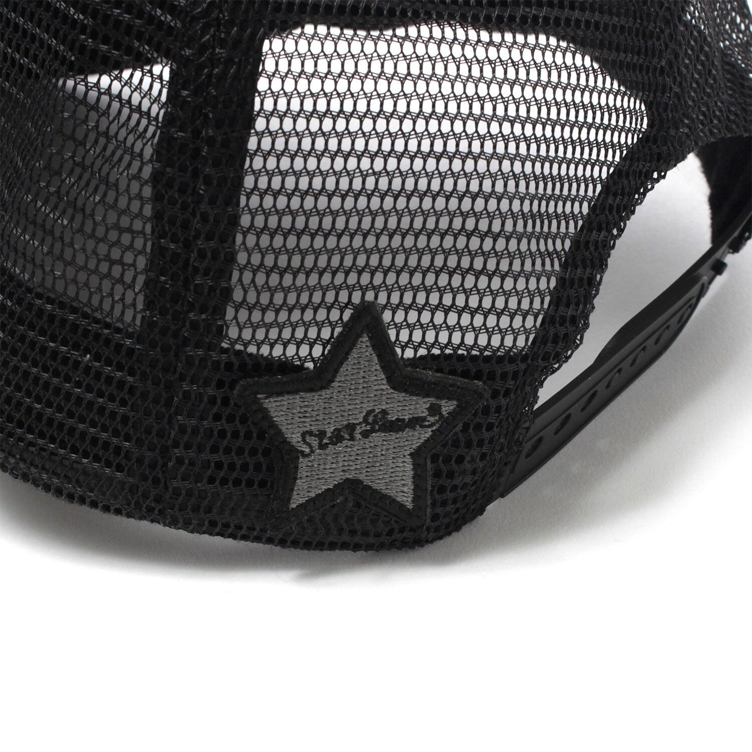 ベーシックなメッシュキャップにツバの先端や、トップにフリンジをデザインしたスターリアンオリジナルのキャップ。本商品は星を5つのパーツで構成した刺繍が特徴の5パーツモデル。刺繍の配色はブルー、ブラック、ホワイト。本体カラーはブラック
