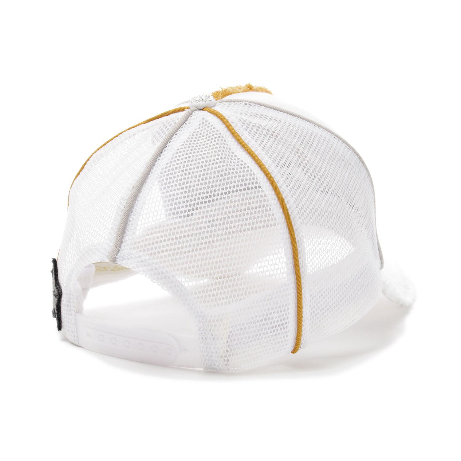 ベーシックなメッシュキャップにツバの先端や、トップにフリンジをデザインしたスターリアンオリジナルのキャップ。本商品は可愛らしいスマイルの星をカラフルな色合いの刺繍で表現したポップなモデル。天ボタンにはスワロを散りばめて他のモデルよりゴージャスな仕上がりが特徴。刺繍や表面のラインをシルバーとゴールドで配色。本体カラーはホワイト。