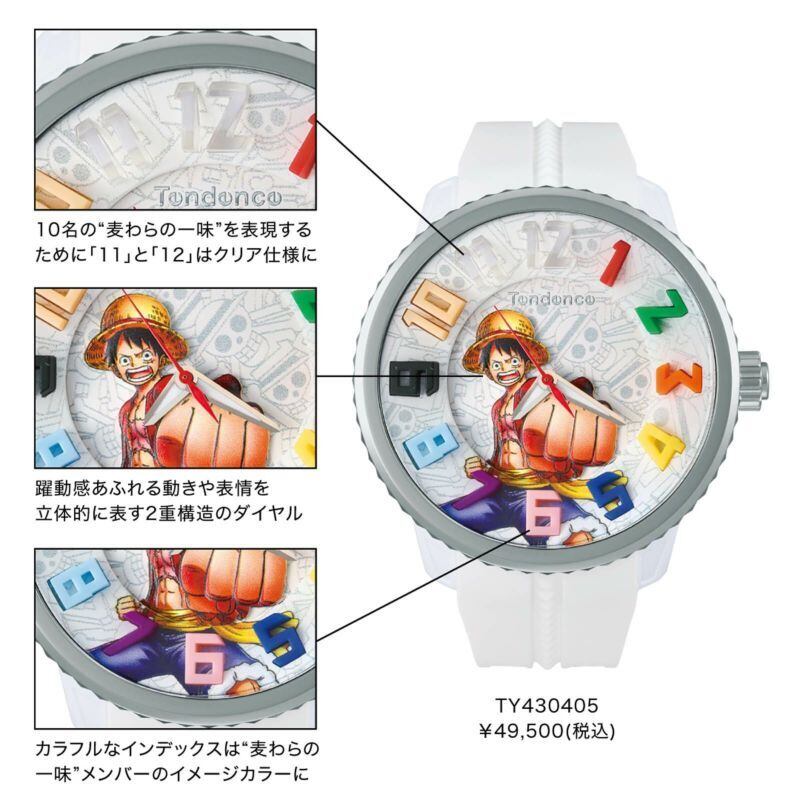 主人公、“麦わらの一味”船長『モンキー・D・ルフィ』を大胆に時計の文字盤に登場させた『ルフィモデル』。中央には、今回のコラボレーションの為に作画したオリジナルのポージングをしたキャラクターを立体的に配置し、ONE PIECEの世界観をダイレクトに表現した腕時計です。インデックス(数字)部分の1~10のカラーには“麦わらの一味”のクルーのイメージカラーを踏襲。全体的に爽やかなホワイトを基調としながらも、カラフルな文字盤で“麦わらの一味”の明るさやパワフルな様子を表現した、ワクワクを届けるデザインになっています。