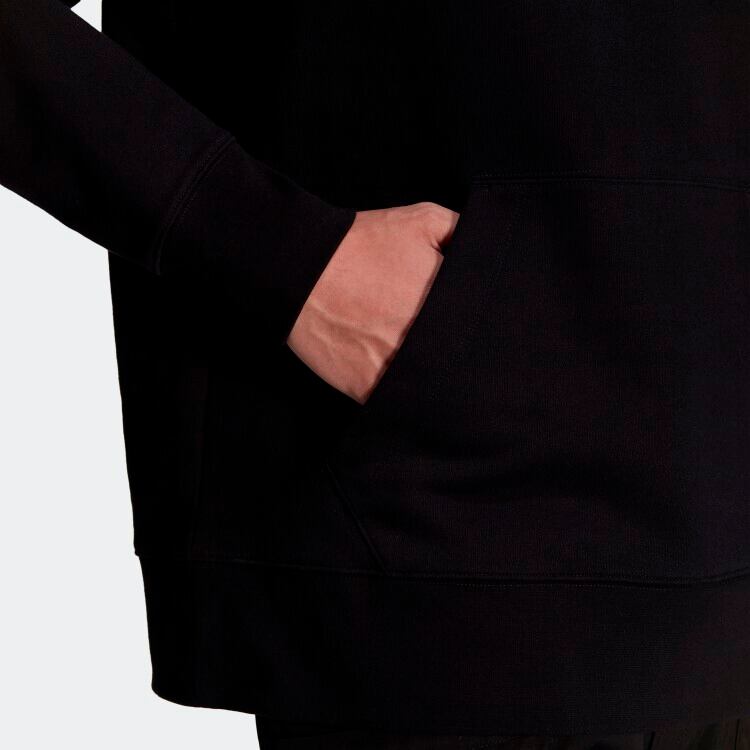 ドローコード付きフード、カンガルーポケット、リブの袖口と裾、同系色のY-3ロゴ。