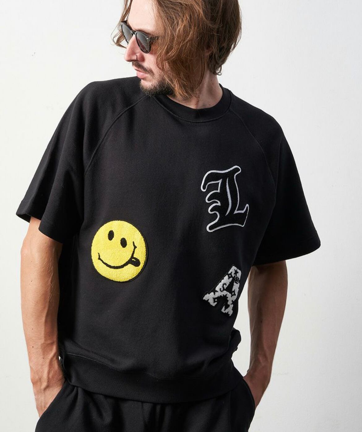 STUD MUFFIN(スタッドマフィン)】8ozラフィ裏毛パイル ランダムサガラパッチルーズフィットSSスエット(314-02556) ブラック