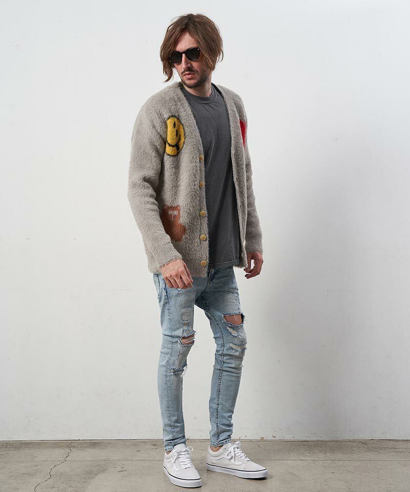 STUD MUFFIN(スタッドマフィン)】シャギーフェザーヤーン 4モチーフジャガードVカーディガン(324-04147) グレー