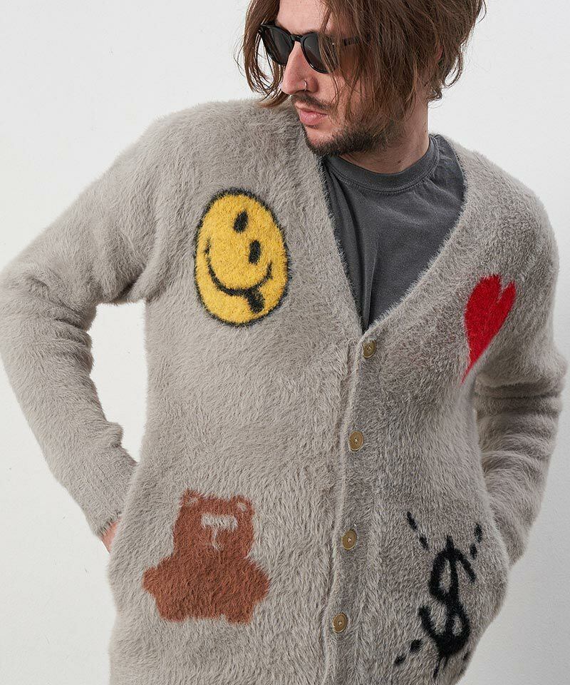 フロントにハート、スマイル、ベア、ドルのモチーフを配したダブルジャガードニットです。