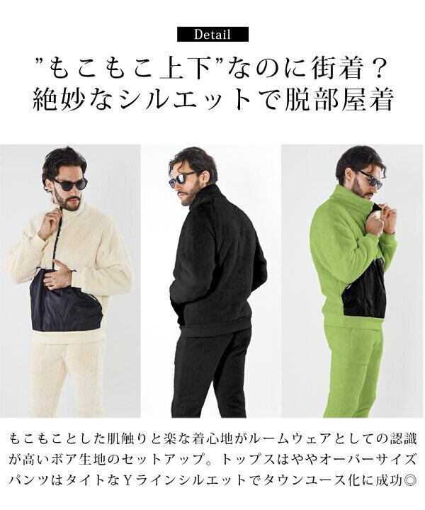 もこもことした肌触りと楽な着心地がルームウェアとしての認識が高いボア生地のセットアップ。トップスはややオーバーサイズ、パンツはタイトなYラインシルエットでタウンユース化に成功。